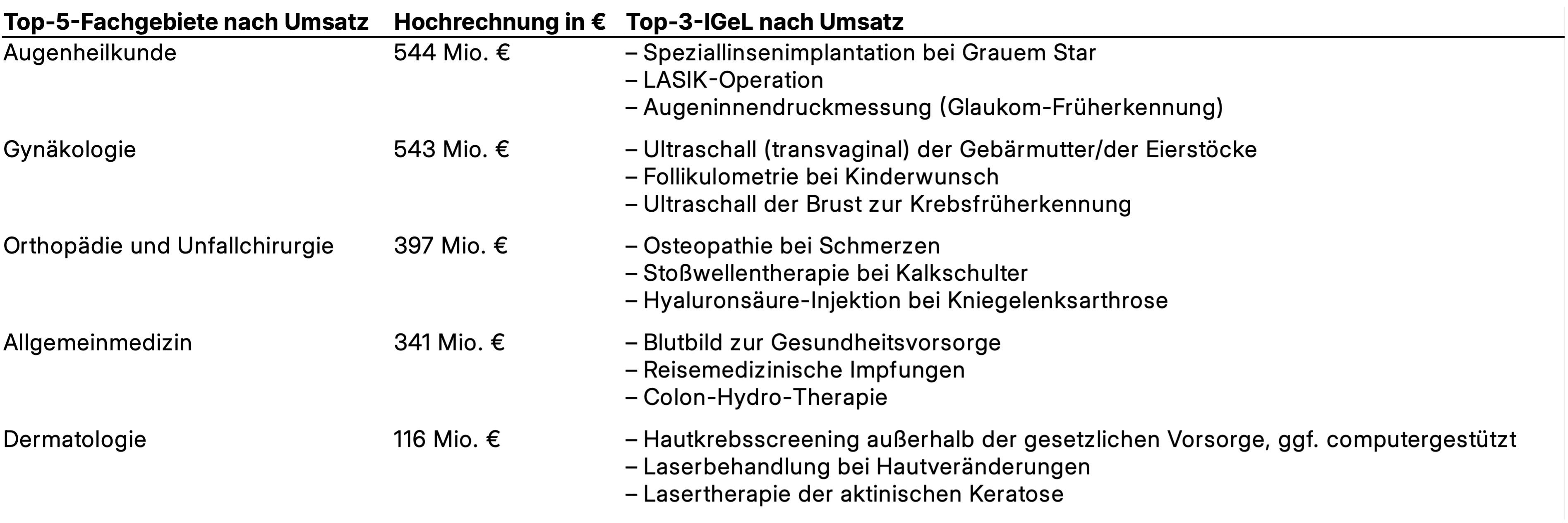 Nach Schätzungen des IGeL-Monitors liegt der IGeL-Umsatz aller Arztpraxen in Deutschland bei mindestens 2,4 Milliarden Euro. Dabei ist der Umsatz mit IGeL pro Praxis abhängig von Fachrichtung und Patientenstruktur. Besonders aktiv sind hier Augenärzt:innen, Gynäkolog:innen und Orthopäd:innen, die zusammen bereits ca. 1,5 Milliarden Euro durch die Abrechnung von IGeL umsetzen.